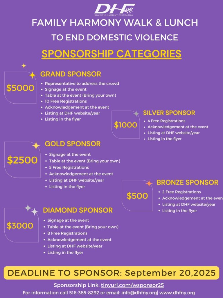 Domestic Harmony Foundation (DHF) provides support, guidance and concrete services to women and children facing various issues related to Domestic Violence and other Human Rights violations in our communities on Long Island.